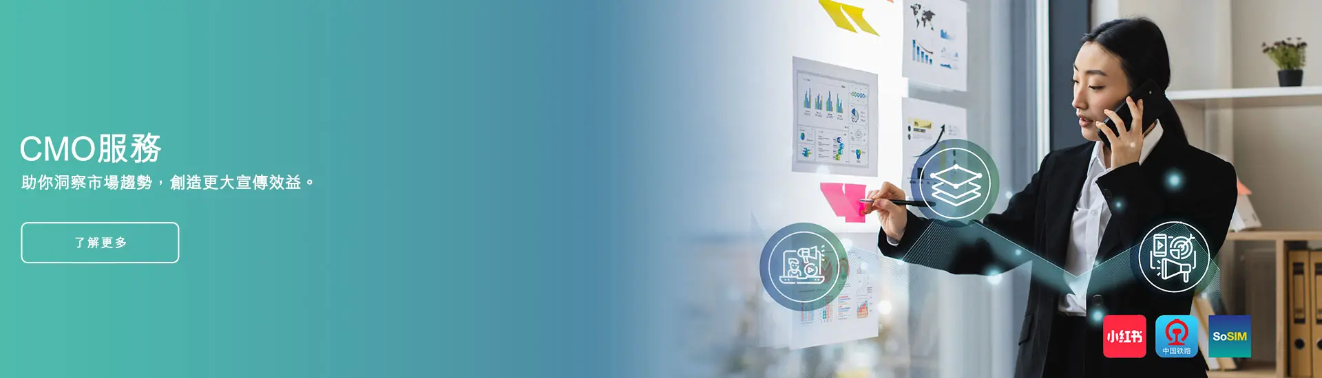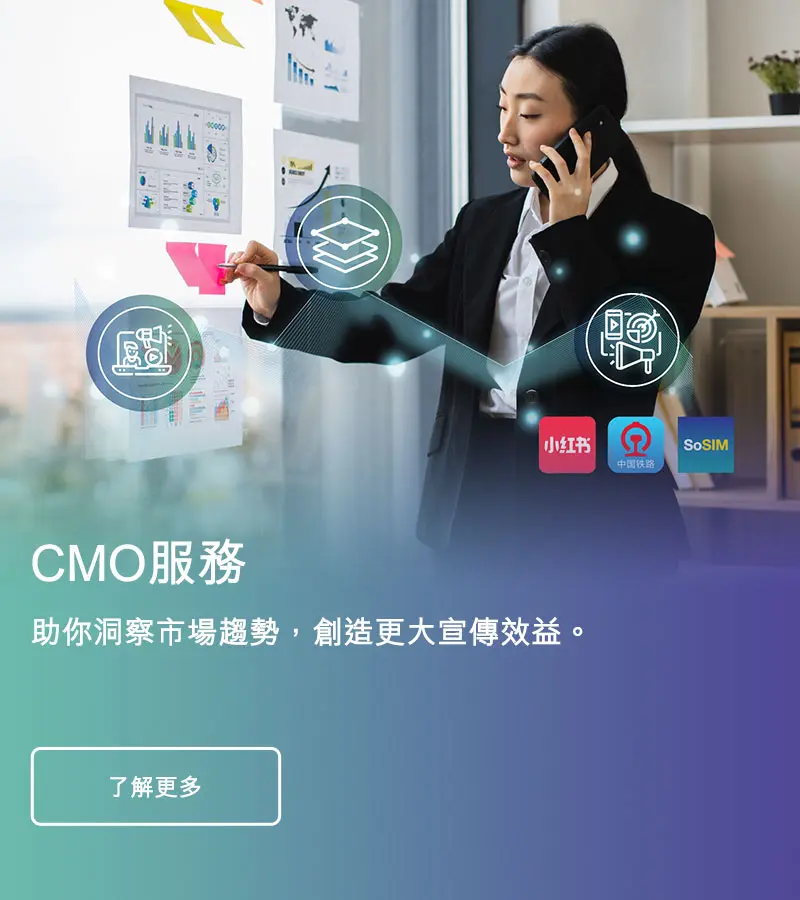 有關服務透過外援市場總監(Chief Marketing Officer, CMO)的角色,以靈活及具成本效益的方式,提供一站式數碼營銷方案,協助中小企應對瞬息萬變的市場變化、提升品牌形象、加強客戶互動,並推動業務及銷售增長。