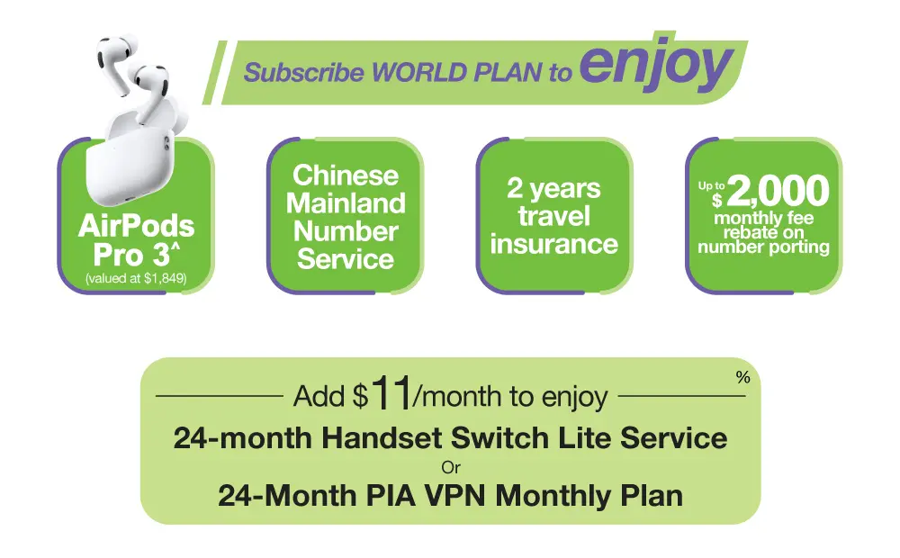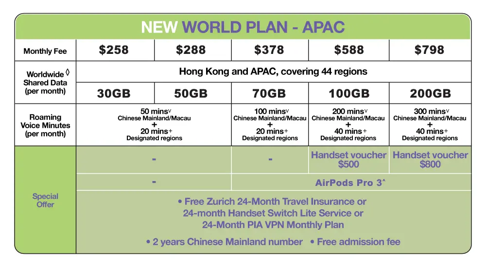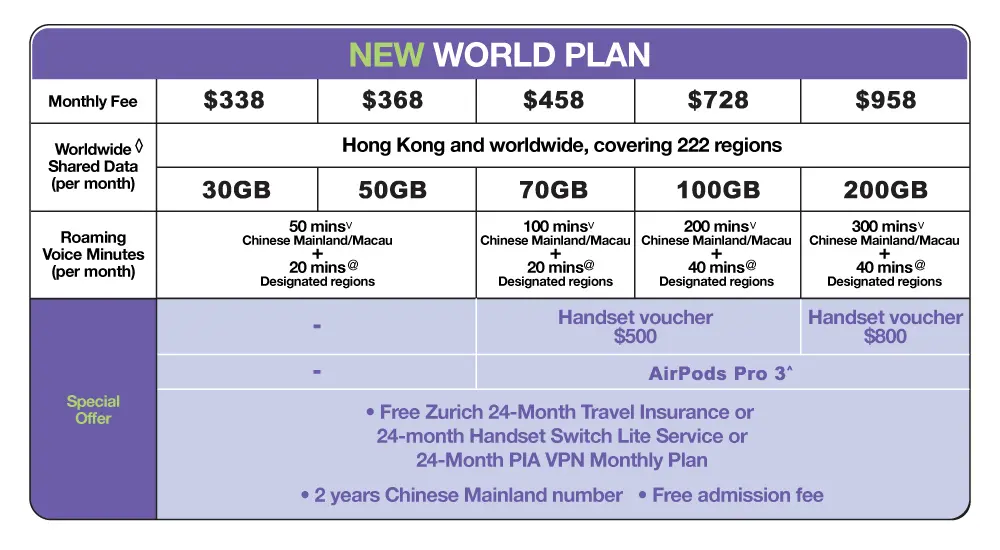 ^Customers are required to submit prepayment $1,000 and subscribe to a designated monthly plan / value-added / contract period services. Offers and gifts apply to specific products only, while stocks last. Terms and conditions apply. ◊There are no additional roaming charges for using data in designated countries/ regions. If you will also travel to other destinations, you may activate other roaming services if needed. When the monthly data usage reaches the plan entitlement, Hong Kong local data service can continue with a maximum local data access speed of 1Mbps. ˅Applicable during the contract period. Voice minute is applicable to incoming calls and outgoing calls to Chinese Mainland, Hong Kong and Macau within Chinese Mainland and Macau. @Applicable during the contract period. Voice minute is applicable for receiving calls, making calls to local and Hong Kong in specified countries/regions. (Specified countries/regions: Australia, Canada, France, Germany, India, Indonesia, Italy, Japan, Malaysia, New Zealand, Philippines, Singapore, South Korea, Spain, Taiwan, Thailand, United Arab Emirates, United Kingdom, USA, Vietnam) +Applicable during the contract period. Voice minute is applicable for receiving calls, making calls to local and Hong Kong in specified countries/regions. (Specified countries/regions: Australia, India, Indonesia, Japan, Malaysia, New Zealand, Philippines, Singapore, South Korea, Taiwan, Thailand, United Arab Emirates, Vietnam) The Russian Government has announced the suspension of data and SMS roaming services for all Mobile Operators, effective immediately and until further notice. Voice roaming services will remain operational Click here to view terms and conditions of "WORLD PLAN". Click here to view terms and conditions of "WORLD PLAN – APAC". Click here to view terms and conditions of "Taipei flight tickets". Click here to view terms and conditions of "Free Zurich 24-Month Travel Insurance". %Click here to view terms and conditions of "Special offer on WORLD PLAN subscription with extra value-added service ($11 x 24months)". |