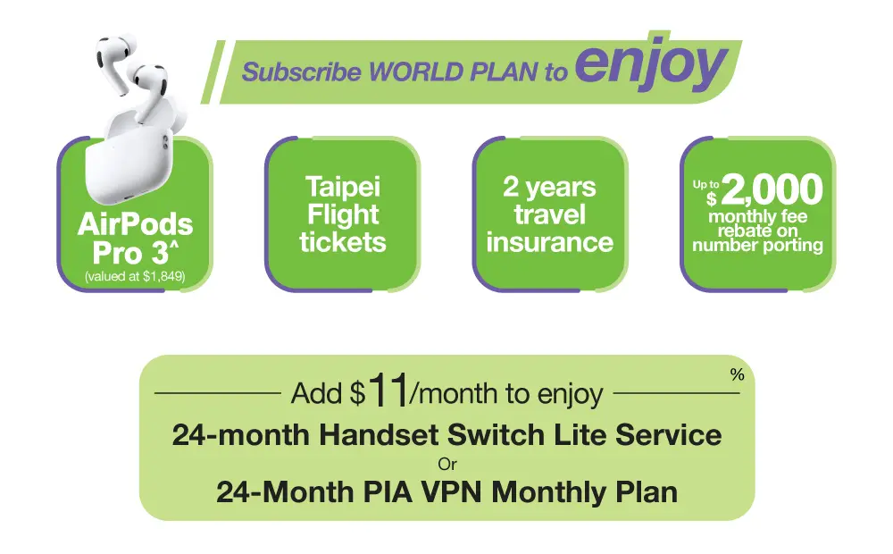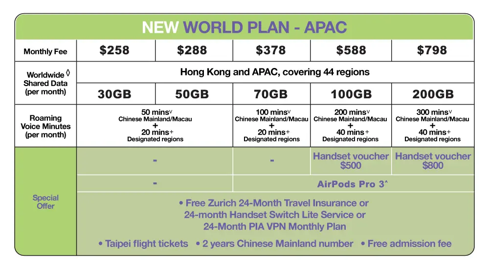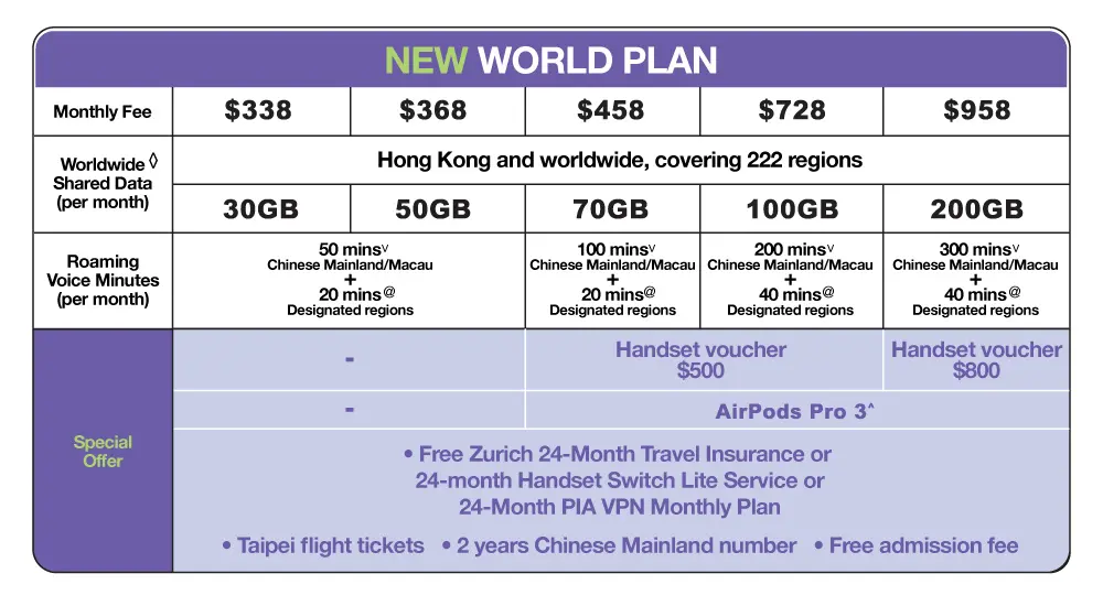 ^Customers are required to submit prepayment $1,000 and subscribe to a designated monthly plan / value-added / contract period services. Offers and gifts apply to specific products only, while stocks last. Terms and conditions apply. ◊There are no additional roaming charges for using data in designated countries/ regions. If you will also travel to other destinations, you may activate other roaming services if needed. When the monthly data usage reaches the plan entitlement, Hong Kong local data service can continue with a maximum local data access speed of 1Mbps. ˅Applicable during the contract period. Voice minute is applicable to incoming calls and outgoing calls to Chinese Mainland, Hong Kong and Macau within Chinese Mainland and Macau. @Applicable during the contract period. Voice minute is applicable for receiving calls, making calls to local and Hong Kong in specified countries/regions. (Specified countries/regions: Australia, Canada, France, Germany, India, Indonesia, Italy, Japan, Malaysia, New Zealand, Philippines, Singapore, South Korea, Spain, Taiwan, Thailand, United Arab Emirates, United Kingdom, USA, Vietnam) +Applicable during the contract period. Voice minute is applicable for receiving calls, making calls to local and Hong Kong in specified countries/regions. (Specified countries/regions: Australia, India, Indonesia, Japan, Malaysia, New Zealand, Philippines, Singapore, South Korea, Taiwan, Thailand, United Arab Emirates, Vietnam) The Russian Government has announced the suspension of data and SMS roaming services for all Mobile Operators, effective immediately and until further notice. Voice roaming services will remain operational Click here to view terms and conditions of "WORLD PLAN". Click here to view terms and conditions of "WORLD PLAN – APAC". Click here to view terms and conditions of "Taipei flight tickets". Click here to view terms and conditions of "Free Zurich 24-Month Travel Insurance". %Click here to view terms and conditions of "Special offer on WORLD PLAN subscription with extra value-added service ($11 x 24months)". |