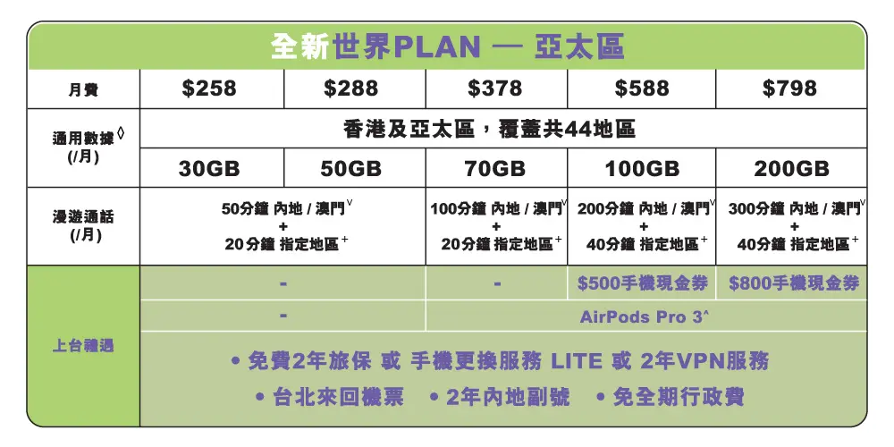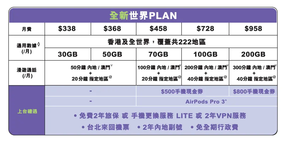 ^須簽指定合約期及預繳$1,000。須選用指定月費計劃/ 增值服務及合約期。數量有限,售/ 送完即止。優惠受條款及細則約束。 ◊於指定國家/地區使用數據無需額外漫遊費。如外遊至其他目的地,亦可以使用其他數據漫遊計劃。當每月使用的數據用量超過該月服務計劃所包含的數據用量,香港本地數據服務仍可繼續而傳輸速度限制最高為1Mbps。 ˅只適用於合約期內。通話分鐘可用於內地及澳門接聽電話、致電內地、香港及澳門。 @只適用於合約期內。通話分鐘可用於指定國家/地區接聽電話、致電當地及香港。(指定國家/地區:澳洲、加拿大、法國、德國、印度、印尼、意大利、日本、馬來西亞、紐西蘭、菲律賓、新加坡、南韓、西班牙、台灣、泰國、阿聯酋、英國、美國、越南) +只適用於合約期內。通話分鐘可用於指定國家/地區接聽電話、致電當地及香港。(指定國家/地區:澳洲、印度、印尼、日本、馬來西亞、紐西蘭、菲律賓、新加坡、南韓、台灣、泰國、阿聯酋、越南) 俄羅斯政府宣布現暫停所有電信業者的數據及SMS短訊漫遊服務,此措施立即生效直至另行通知為止; 語音漫遊服務則維持正常運作 按此瀏覽「世界PLAN」服務條款及細則。 按此瀏覽「世界PLAN–亞太區」服務條款及細則。 按此瀏覽「台北來回機票」服務條款及細則。 按此瀏覽「免費蘇黎世24個月旅遊保險」服務條款及細則。 %按此瀏覽「「世界PLAN」加購增值服務優惠 ($11x 24個月)」服務條款及細則。 |