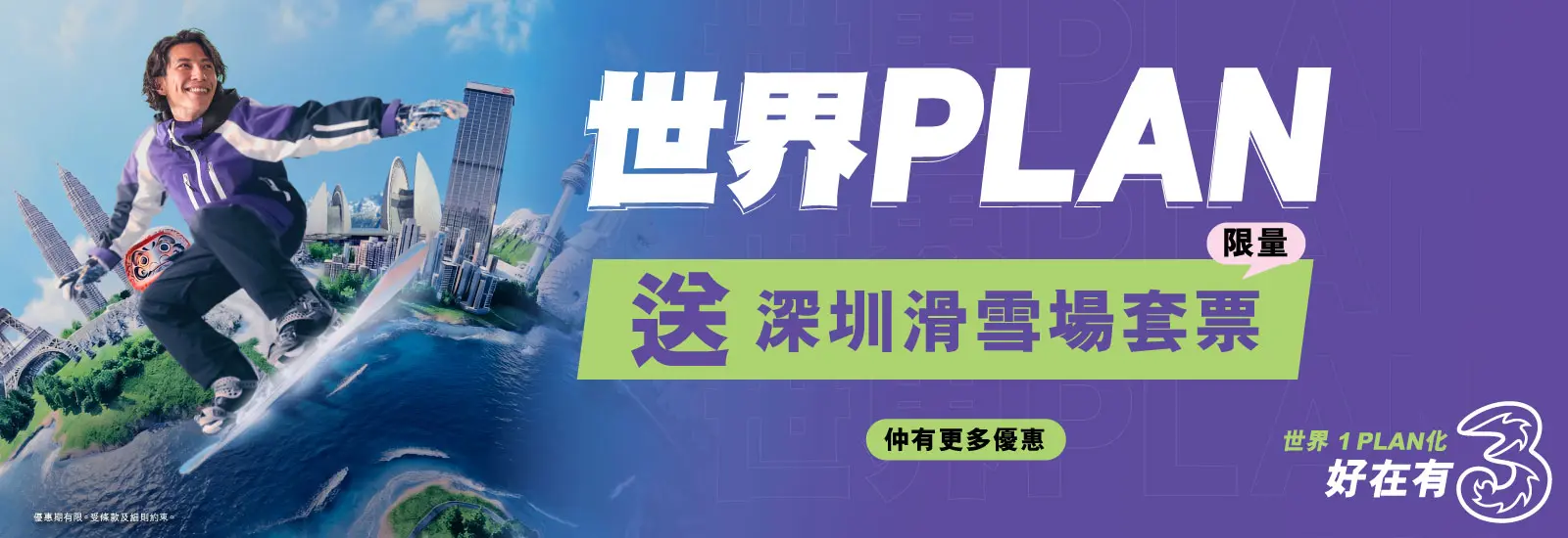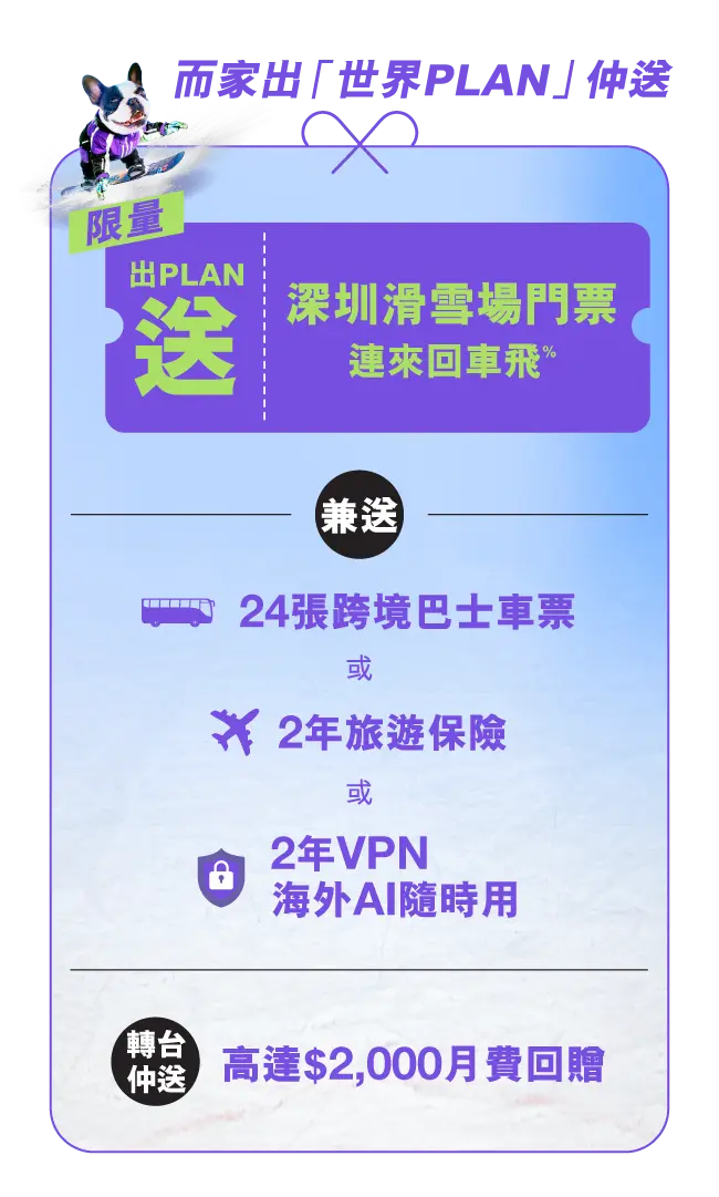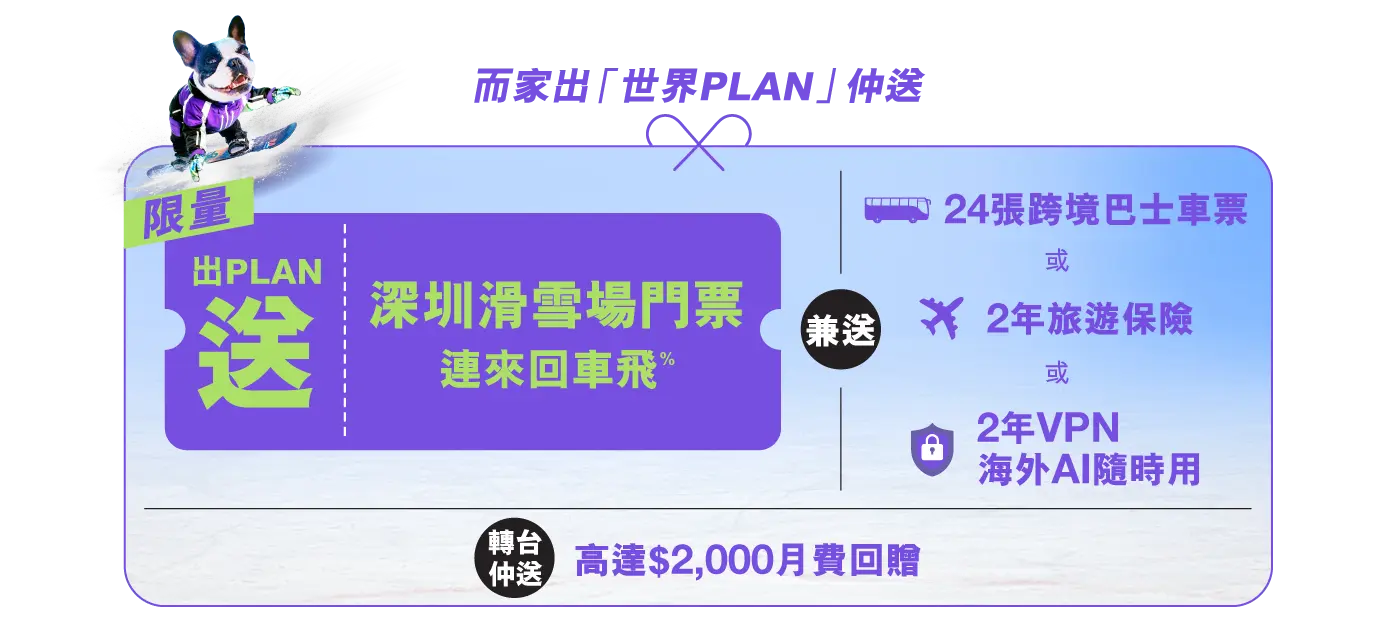 %【深圳華發冰雪熱雪奇跡X 環島中港通直通巴士】套票優惠只適用於指定70GB或以上之5G世界PLAN服務計劃。優惠期至2026年5月31日,送完即止。受條款及細則約束。
