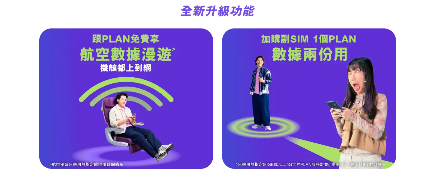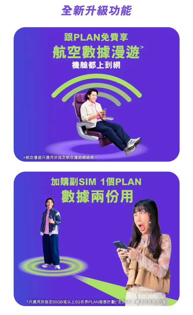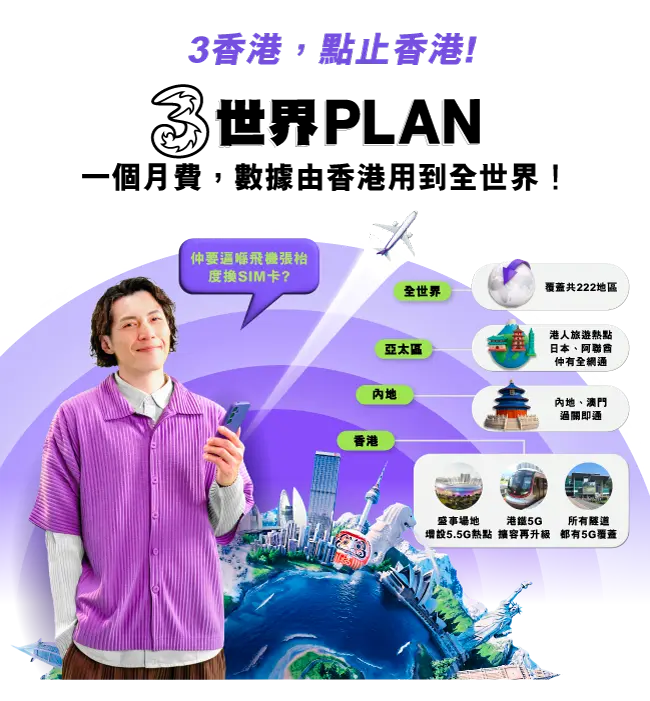 優惠期至2026年9月30日。須簽指定月費計劃。手機現金券適用於指定手機。優惠及服務受條款及細則約束。 ◊於指定國家/地區使用數據無需額外漫遊費。如外遊至其他目的地,亦可以使用其他數據漫遊計劃。當每月使用的數據用量超過該月服務計劃所包含的數據用量,香港本地數據服務仍可繼續而傳輸速度限制最高為1Mbps。 ˅只適用於合約期內。通話分鐘可用於內地及澳門接聽電話、致電內地、香港及澳門。 @只適用於合約期內。通話分鐘可用於指定國家/地區接聽電話、致電當地及香港。(指定國家/地區:澳洲、加拿大、法國、德國、印度、印尼、意大利、日本、馬來西亞、紐西蘭、菲律賓、新加坡、南韓、西班牙、台灣、泰國、阿聯酋、英國、美國、越南) +只適用於合約期內。通話分鐘可用於指定國家/地區接聽電話、致電當地及香港。(指定國家/地區:澳洲、印度、印尼、日本、馬來西亞、紐西蘭、菲律賓、新加坡、南韓、台灣、泰國、阿聯酋、越南) *優惠期至2026年9月30日。客戶於優惠期內新上台世界PLAN,合約期內享每月額外外遊通話分鐘。 **俄羅斯外遊注意**:建議到埗後連接至VimpelCom網絡 (須關閉VPN),並於 http://balance.beeline.ru/guest 完成驗證以即時使用數據及短訊漫遊服務,按此瀏覽詳細教學 按此瀏覽「世界PLAN」服務條款及細則。 按此瀏覽「世界PLAN–亞太區」服務條款及細則。 按此瀏覽「免費蘇黎世24個月旅遊保險」服務條款及細則。 按此瀏覽「手機更換服務Lite」服務條款及細則(第7點)。 按此瀏覽「24個月PIA VPN月費計劃」服務條款及細則。 「24張跨境巴士車票」為「環島中港通巴士通行證(24個月合約 - 共24張跨境巴士車票)」服務,只適用於指定路線及時段,按此瀏覽條款及細則。 |