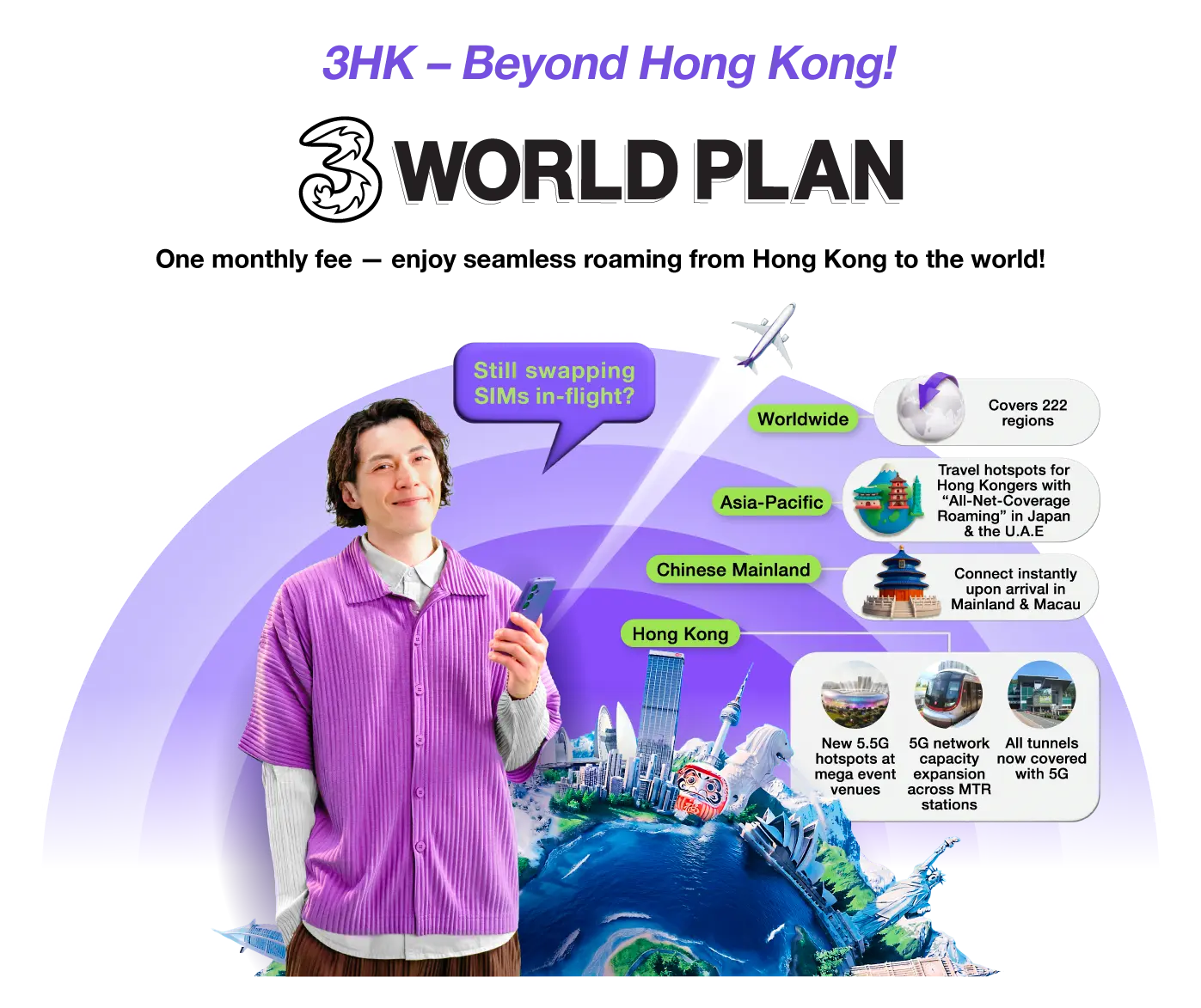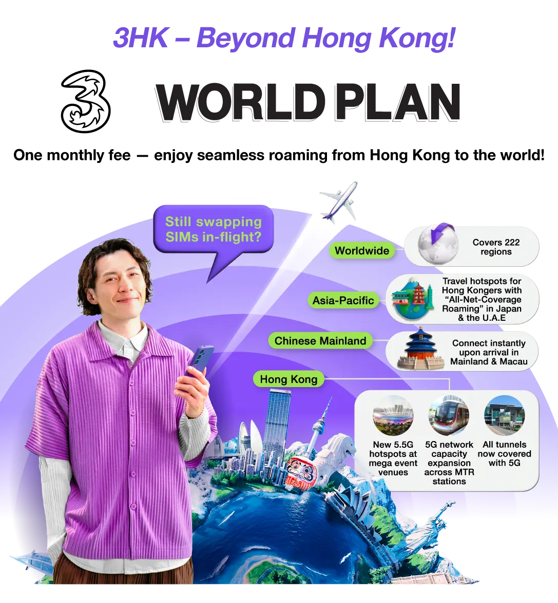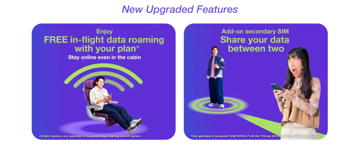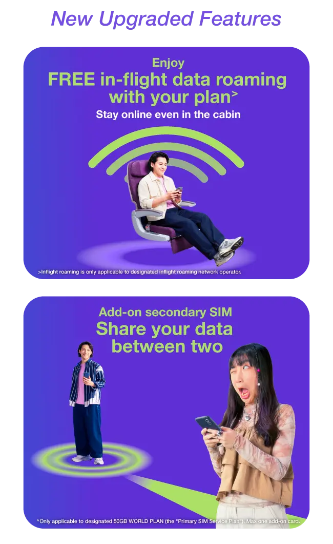 Offer valid until 31 March 2026. Customers are required to subscribe to a designated monthly plan. Handset coupon applies to selected devices only. Terms and conditions apply. ◊There are no additional roaming charges for using data in designated countries/ regions. If you will also travel to other destinations, you may activate other roaming services if needed. When the monthly data usage reaches the plan entitlement, Hong Kong local data service can continue with a maximum local data access speed of 1Mbps. ˅Applicable during the contract period. Voice minute is applicable to incoming calls and outgoing calls to Chinese Mainland, Hong Kong and Macau within Chinese Mainland and Macau. @Applicable during the contract period. Voice minute is applicable for receiving calls, making calls to local and Hong Kong in specified countries/regions. (Specified countries/regions: Australia, Canada, France, Germany, India, Indonesia, Italy, Japan, Malaysia, New Zealand, Philippines, Singapore, South Korea, Spain, Taiwan, Thailand, United Arab Emirates, United Kingdom, USA, Vietnam) +Applicable during the contract period. Voice minute is applicable for receiving calls, making calls to local and Hong Kong in specified countries/regions. (Specified countries/regions: Australia, India, Indonesia, Japan, Malaysia, New Zealand, Philippines, Singapore, South Korea, Taiwan, Thailand, United Arab Emirates, Vietnam) *Promotion period valid until 31 March 2026. Subscribe WORLD PLAN within the promotion period to enjoy bonus roaming voice minutes per month during contract period. Click here to view terms and conditions of "WORLD PLAN". Click here to view terms and conditions of "WORLD PLAN – APAC". Click here to view terms and conditions of "Free Zurich 24-Month Travel Insurance". Click here to view terms and conditions of "Handset Switch Lite" (Clause #7). Click here to view terms and conditions of "24-Month PIA VPN Monthly Plan". "24 Cross-border Bus Tickets" refers to the "Trans-Island Chinalink Bus Pass (24-month contract - 24 cross-border bus tickets)" service, which is only applicable to designated routes and time periods. Click here to view the terms and conditions. |