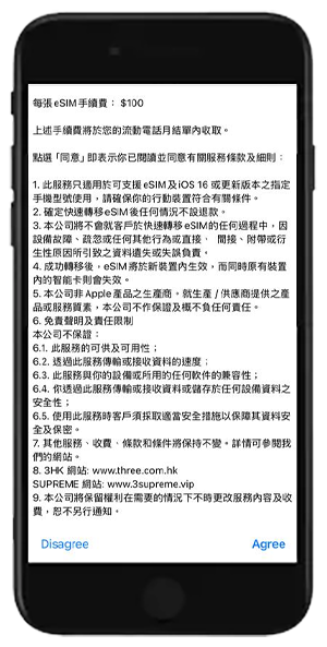 Once installed, an eSIM cannot be removed or directly transferred to another device—doing so will render the eSIM invalid. To transfer your eSIM to a new device, please visit any 3Shop or Click here to apply for SIM replacement. Customers can enjoy up to 3 times service fee waivers per year, thereafter $50 will apply to each request.
