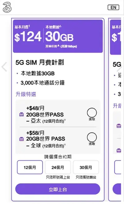 12個月 24個月 只限新號碼上台 30個月 只限攜號轉台 立即上台
